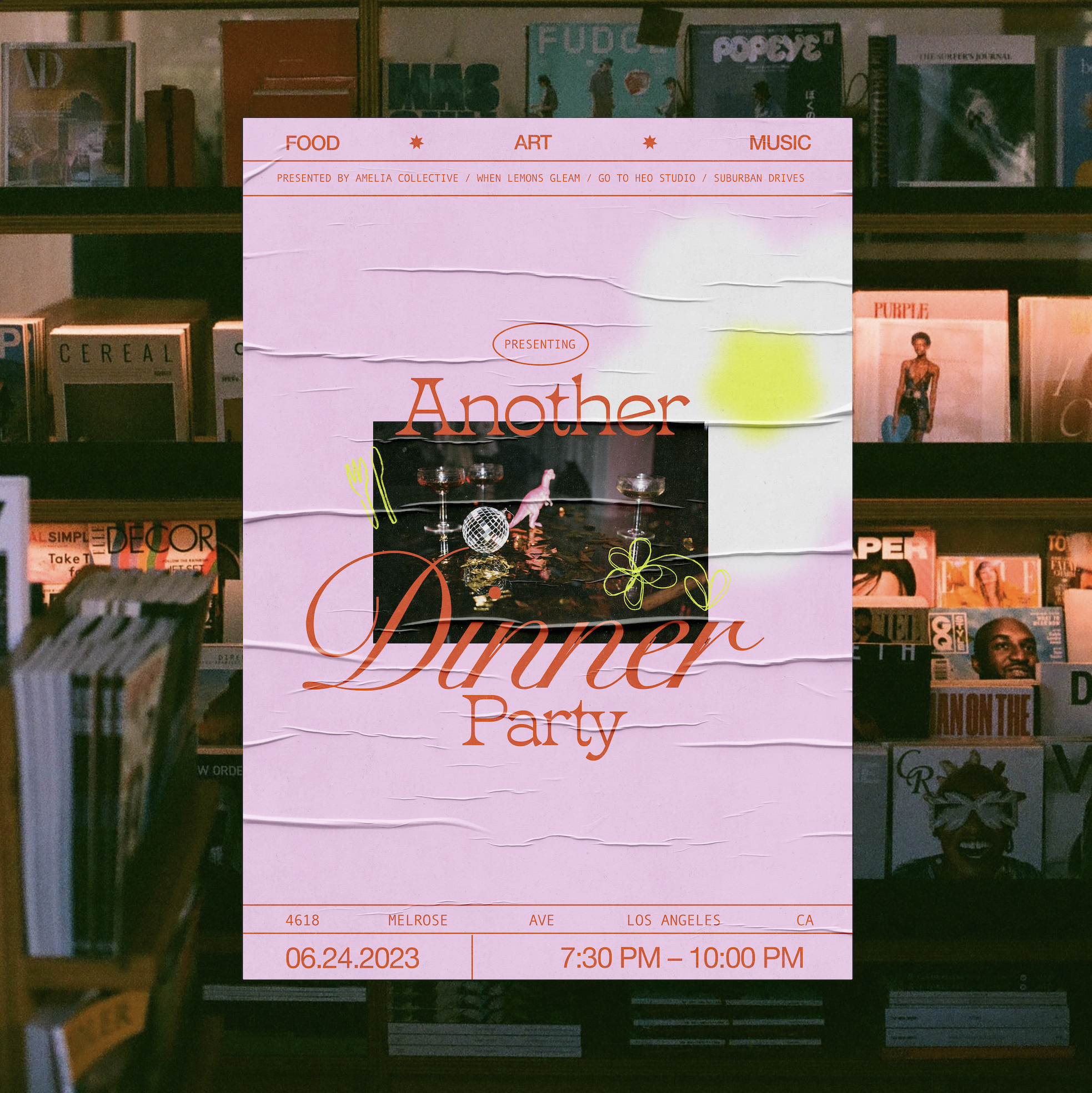 The event takes place in an intimate LA restaurant that transforms into a cozy lounge during the evening. There, you will find live performers, a wall full of books and art, natural wine, homemade eats, as well as a small shop to take a piece of the party home with you.