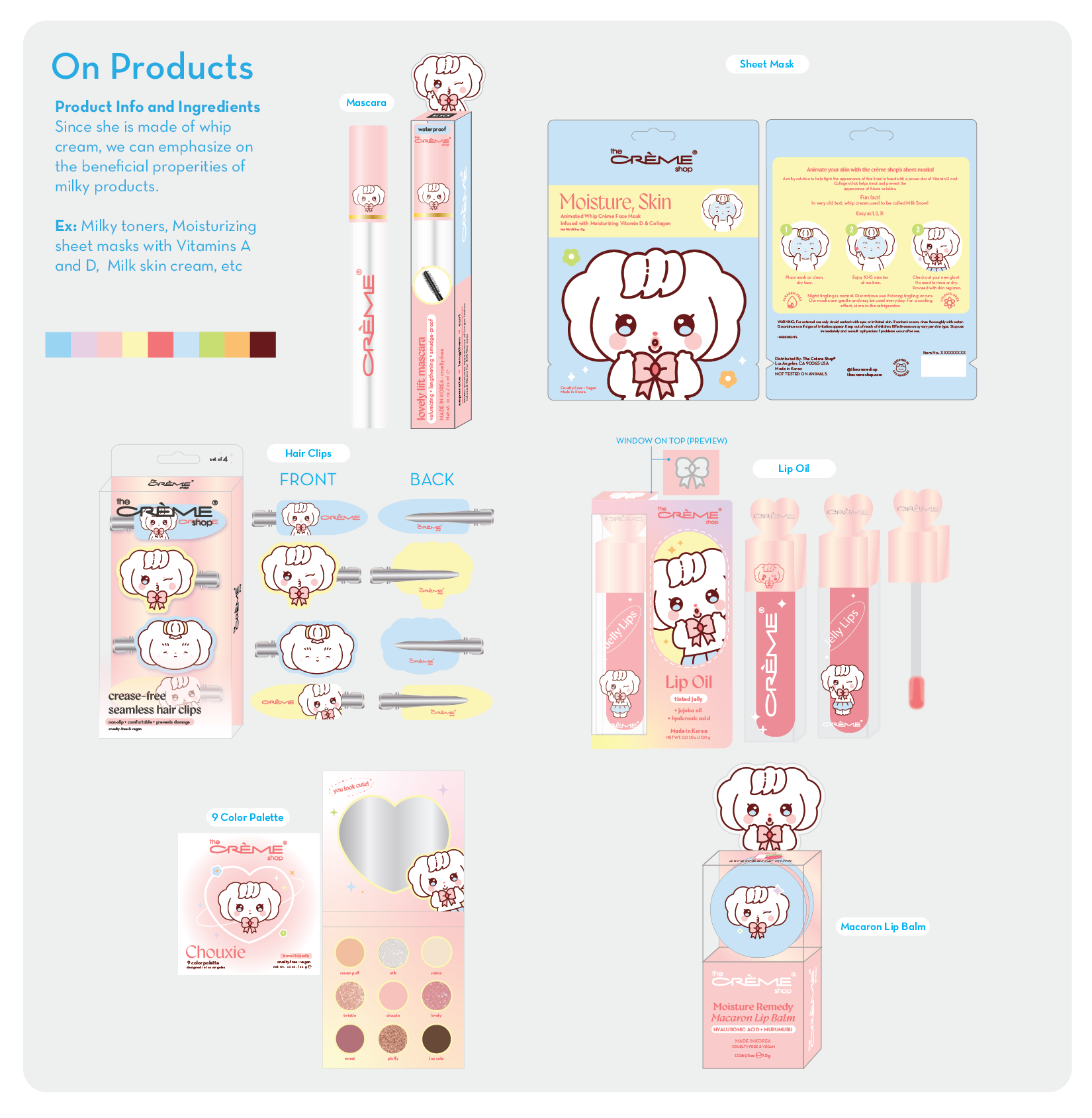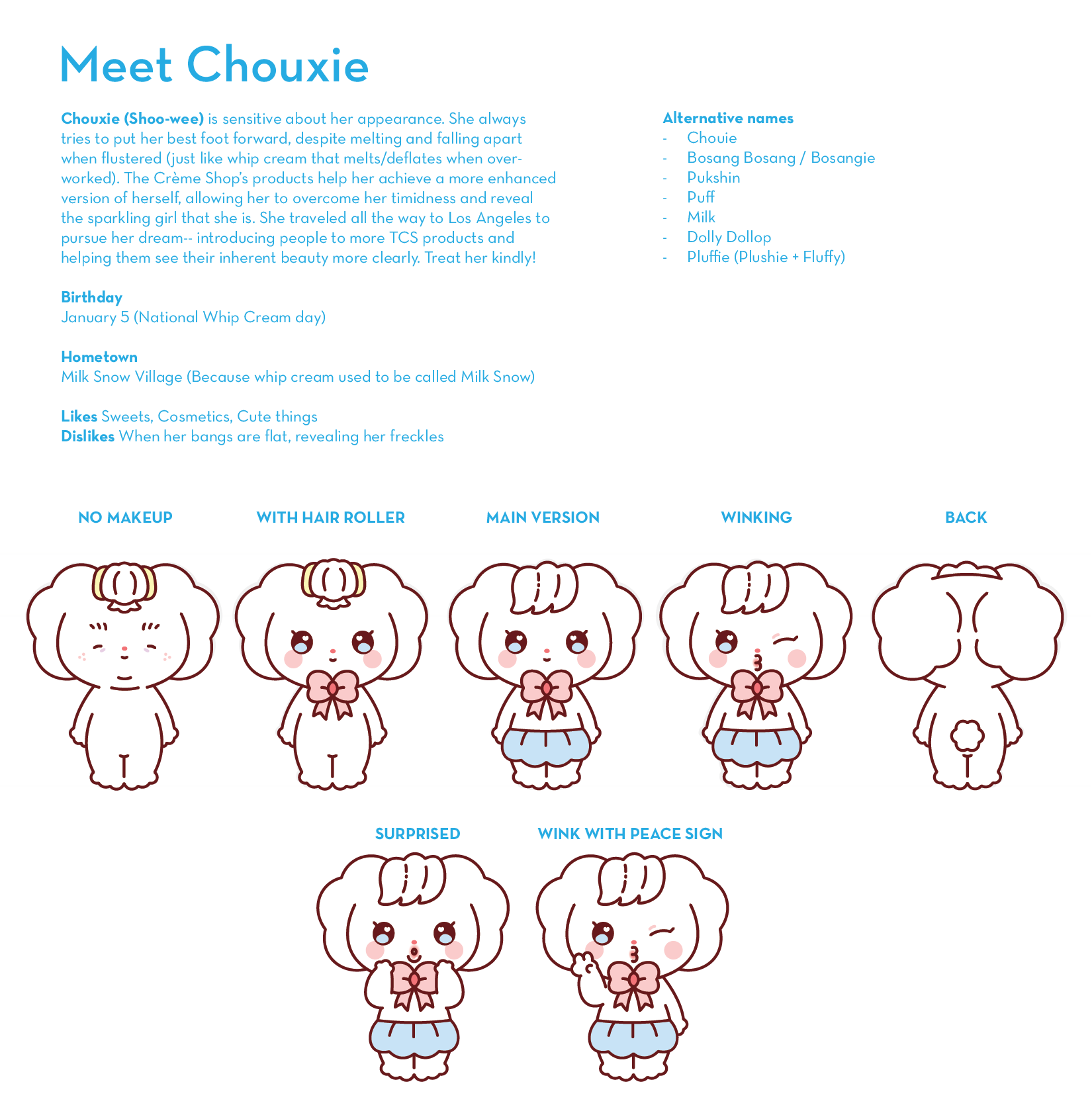 Chouxie is my original conceptual character developed for The Crème Shop. An in-office mascot design competition was hosted to develop different characters that revolved around whipped cream, beauty, and cuteness. As a result, I created Chouxie, a small dollop of whipped cream with fluffy bangs, sparkling eyes, and a cute attitude.